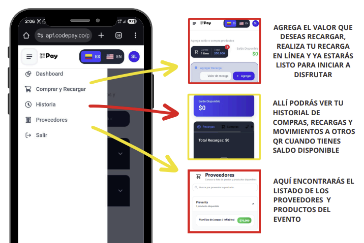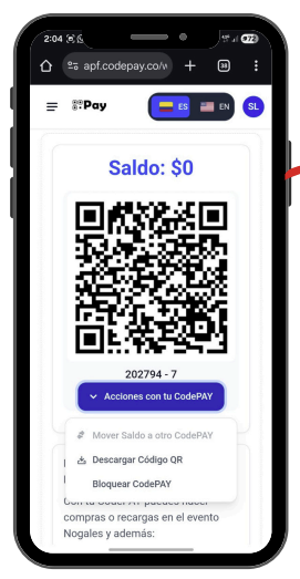 • Recargas en efectivo o tarjeta: Si prefieres no usar medios digitales o necesitas más saldo durante el día, el día del evento se habilitarán puntos físicos donde podrás recargar tu CodePay con efectivo o tarjeta